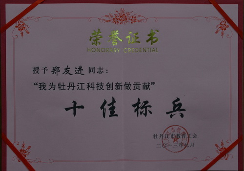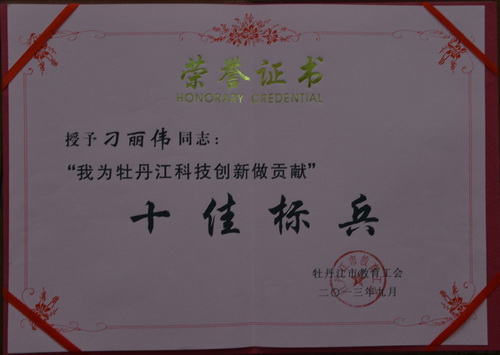 在牡丹江教育工会今年九月组织的“我为牡丹江市科技创新做贡献”十佳标兵活动评选中,我校历史与文化学院院长刁丽伟教授、工学院副院长郑友进副教授获“我为牡丹江市科技创新做贡献”十佳标兵称号。