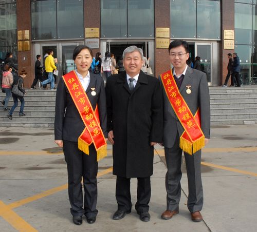 4月26日早,校党委常委、工会主席王德义送博士蔡雪教授和博士赵宝江教授参加市劳模表彰大会。